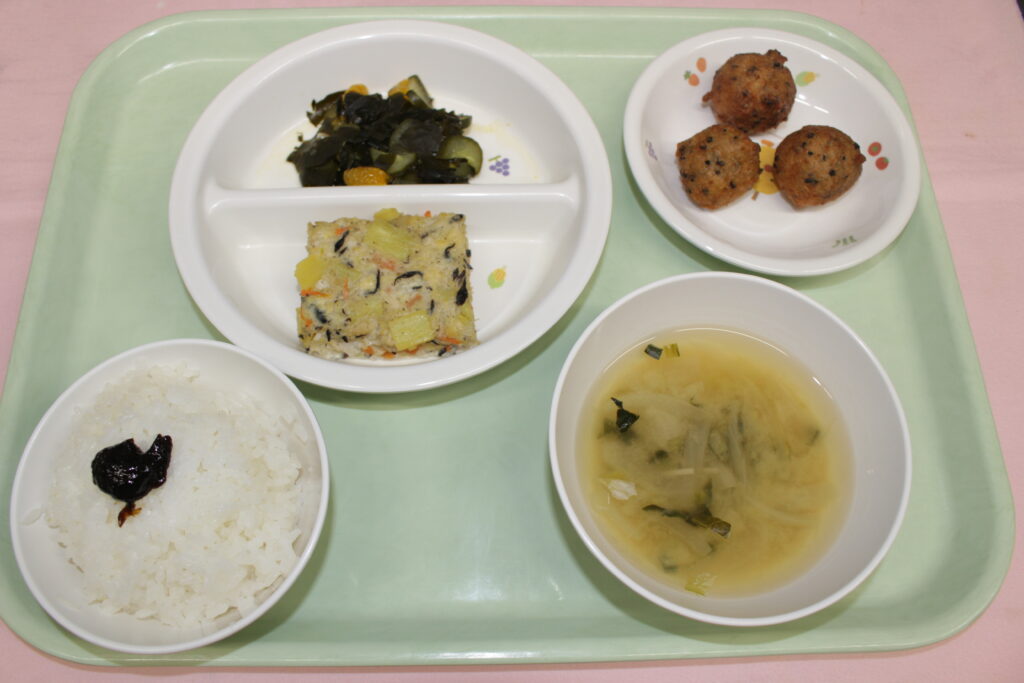 わかめご飯焼きししゃも田舎煮豆乳汁パイン